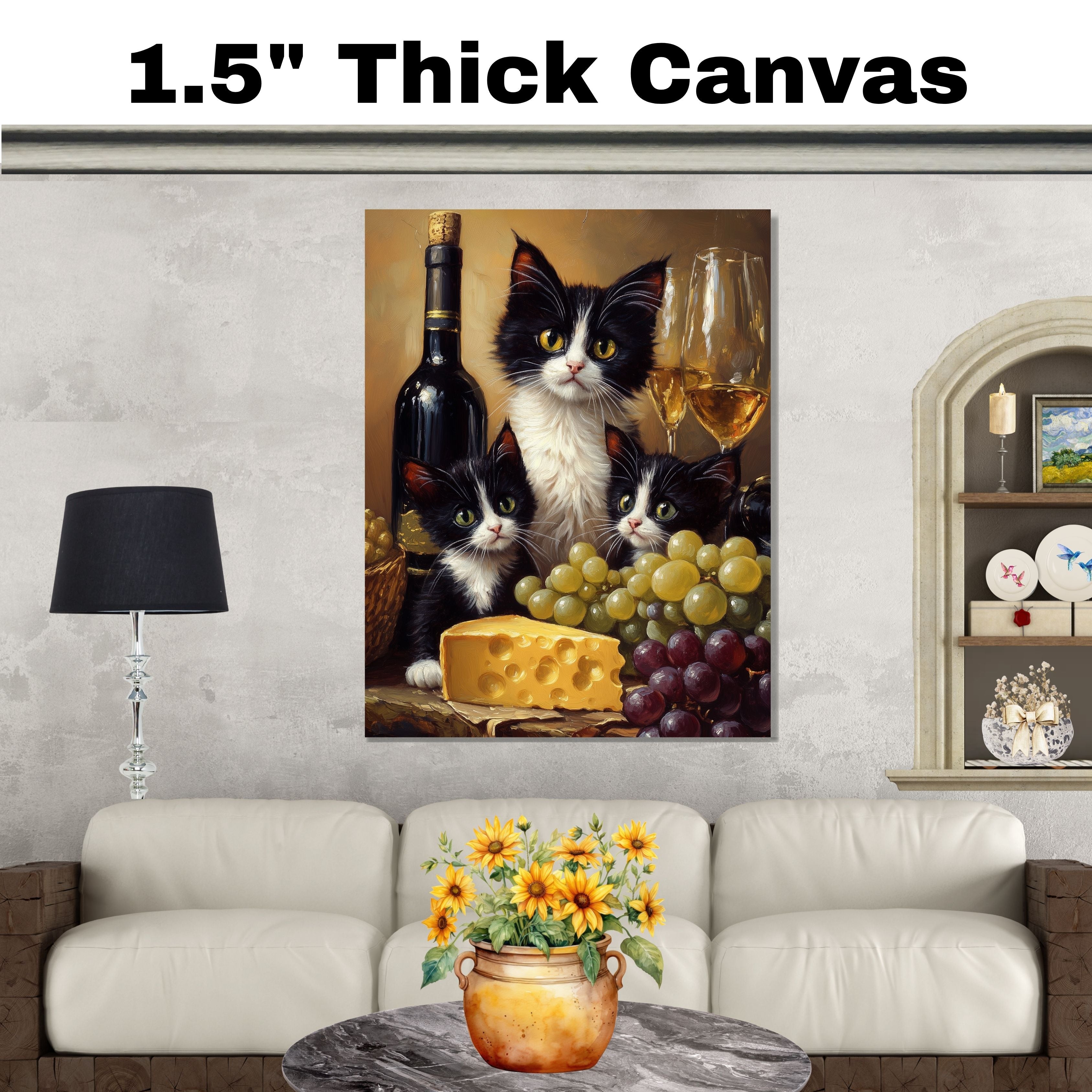 Wine and Whiskers: Tuxedo Cat Mom and Kittens Among Grapes and Cheese on Ready to Hang 1.5" Thick Canvas Wrap, Floating Framed Canvas, Flat Rolled Canvas