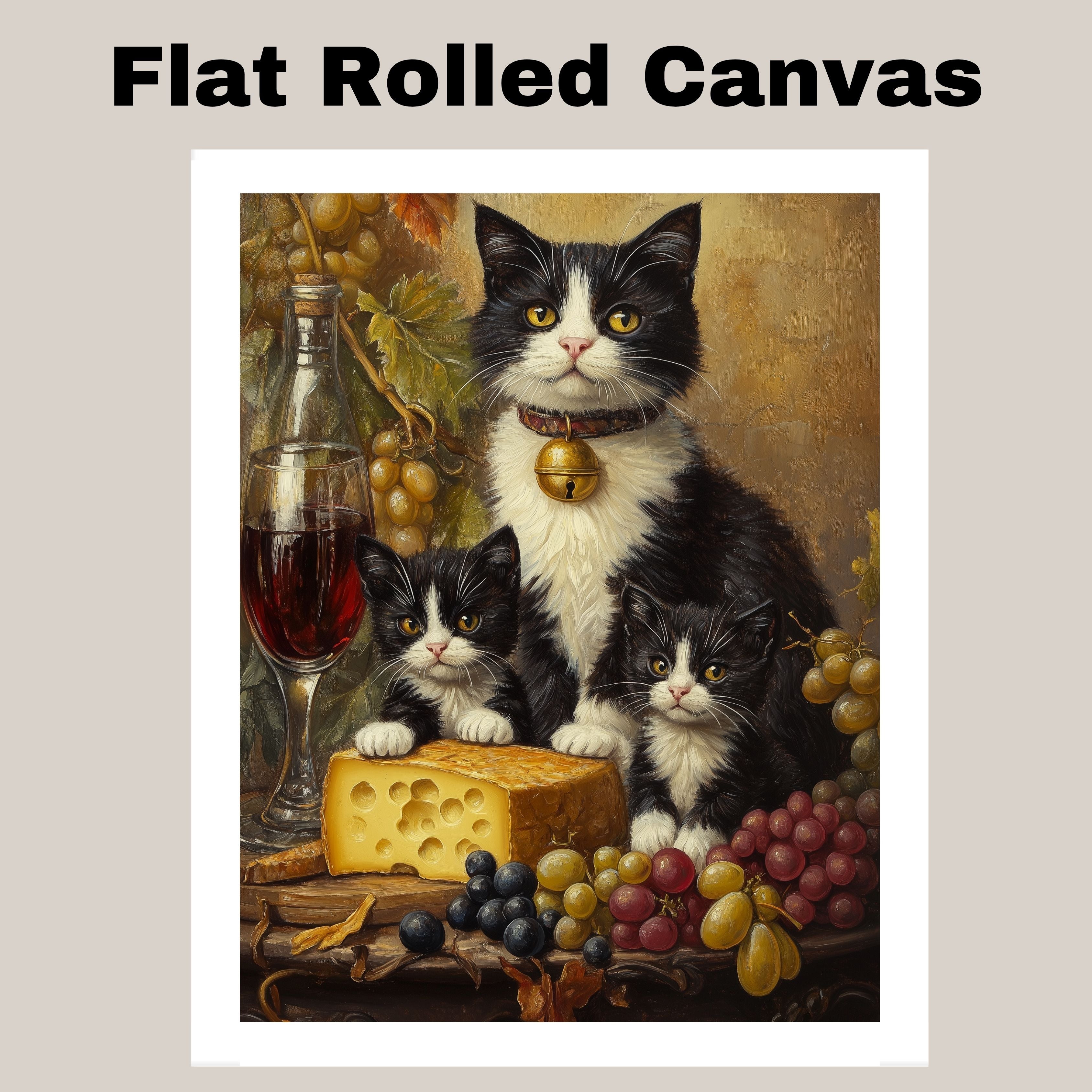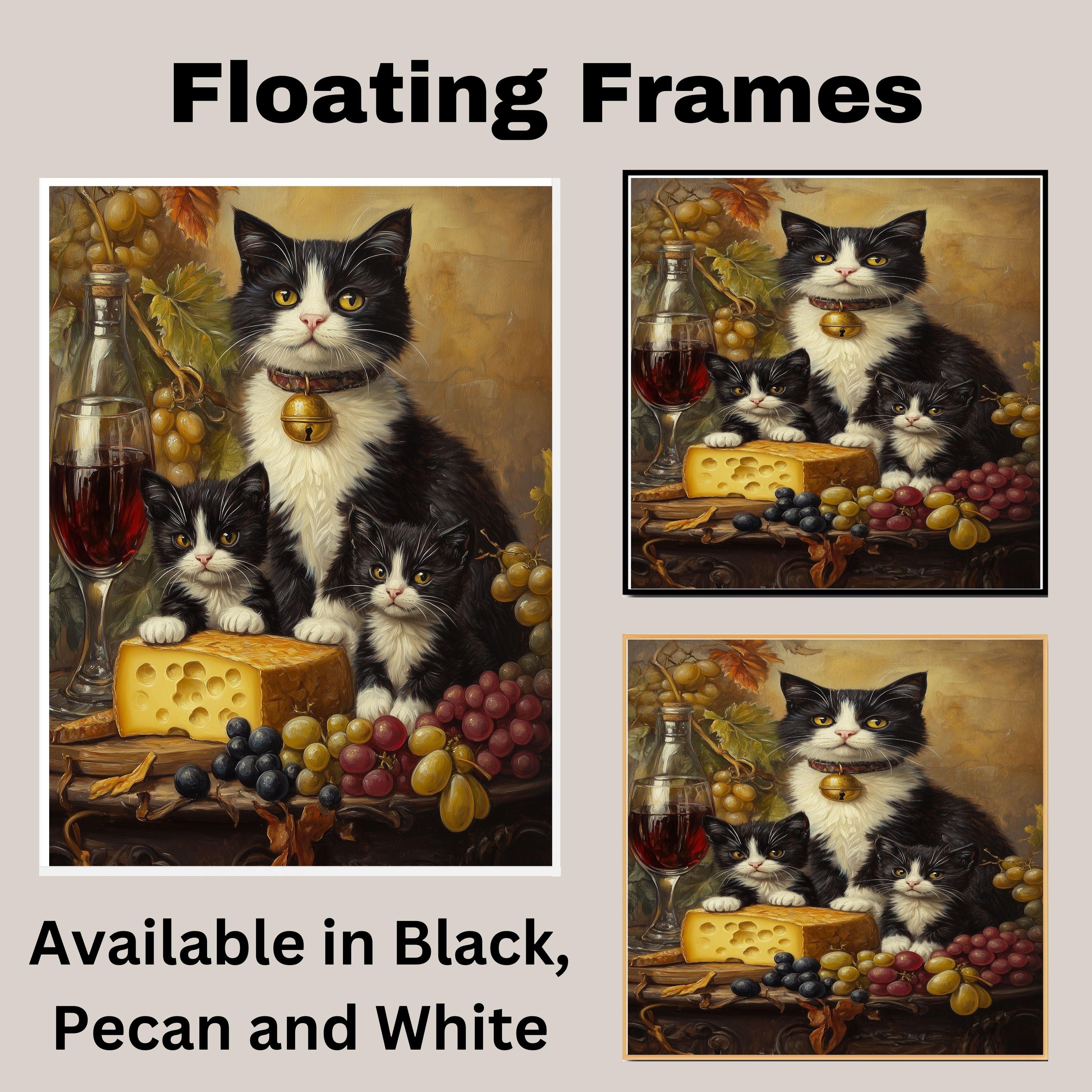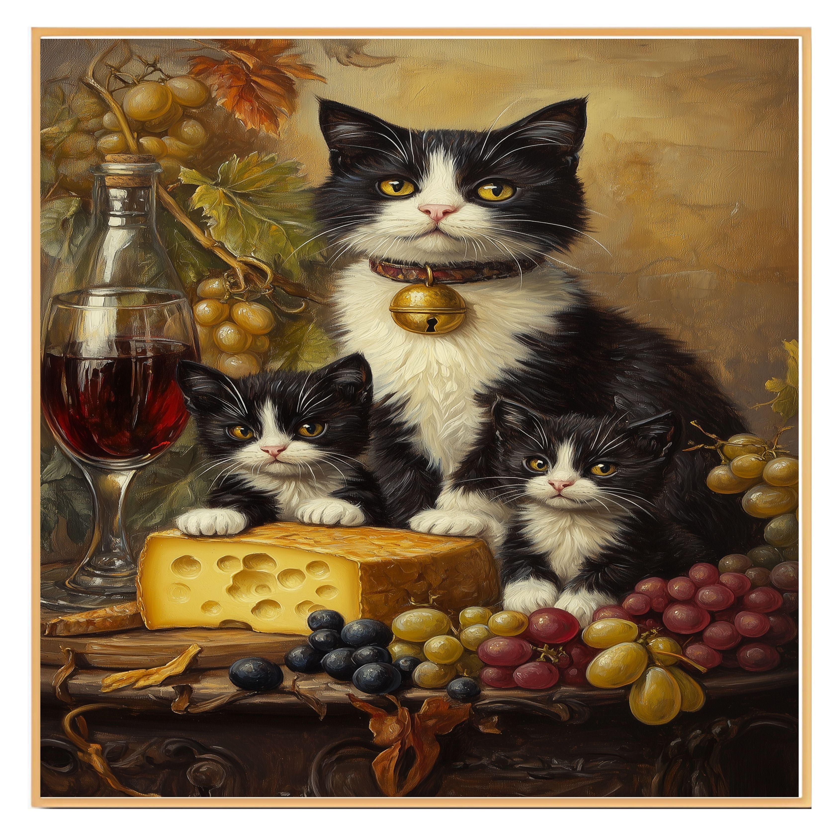 Wine & Whiskers: Tuxedo Mom and Kittens Enjoying Grapes and Cheese on Ready to Hang 1.5" Thick Canvas Wrap, Floating Framed Canvas, Flat Rolled Canvas