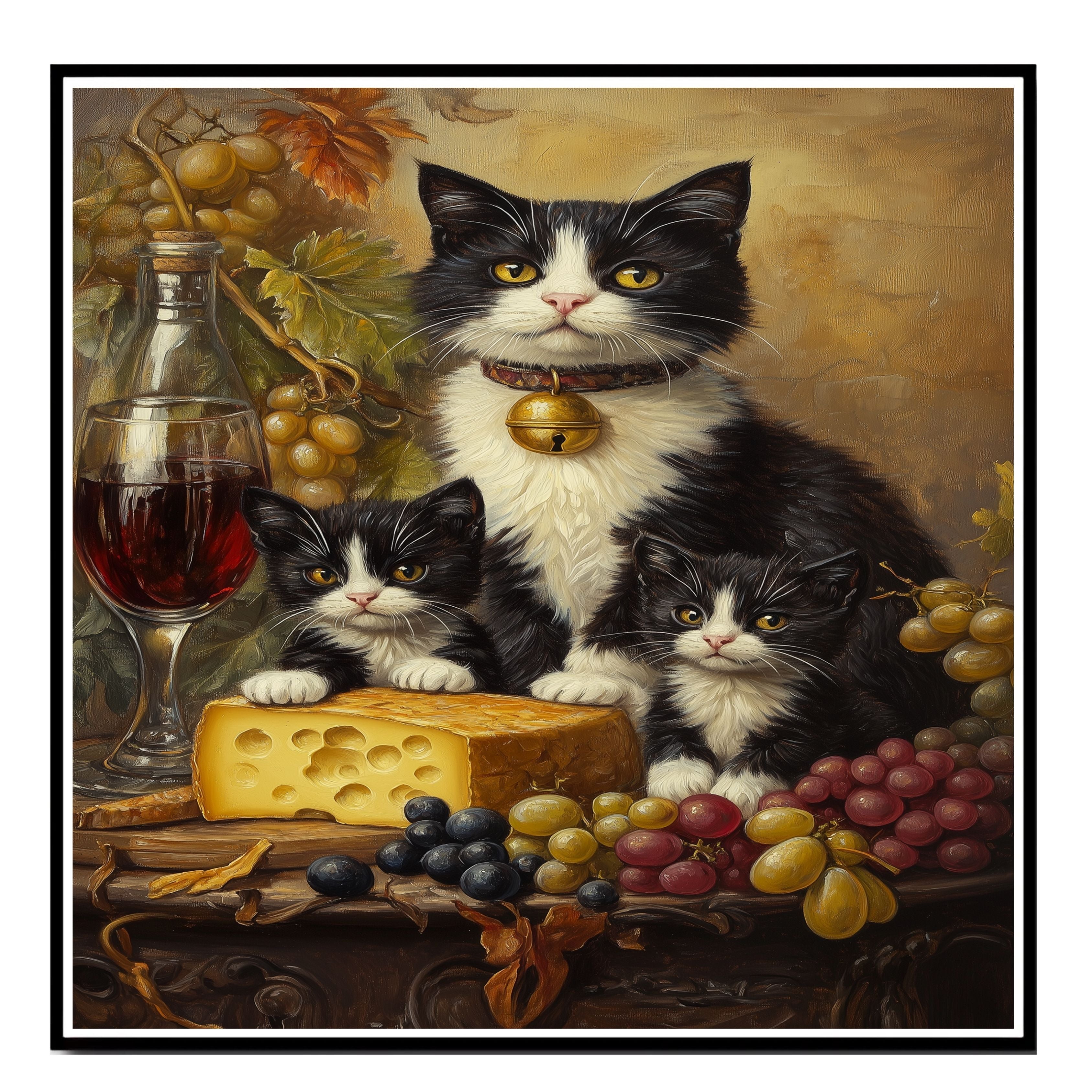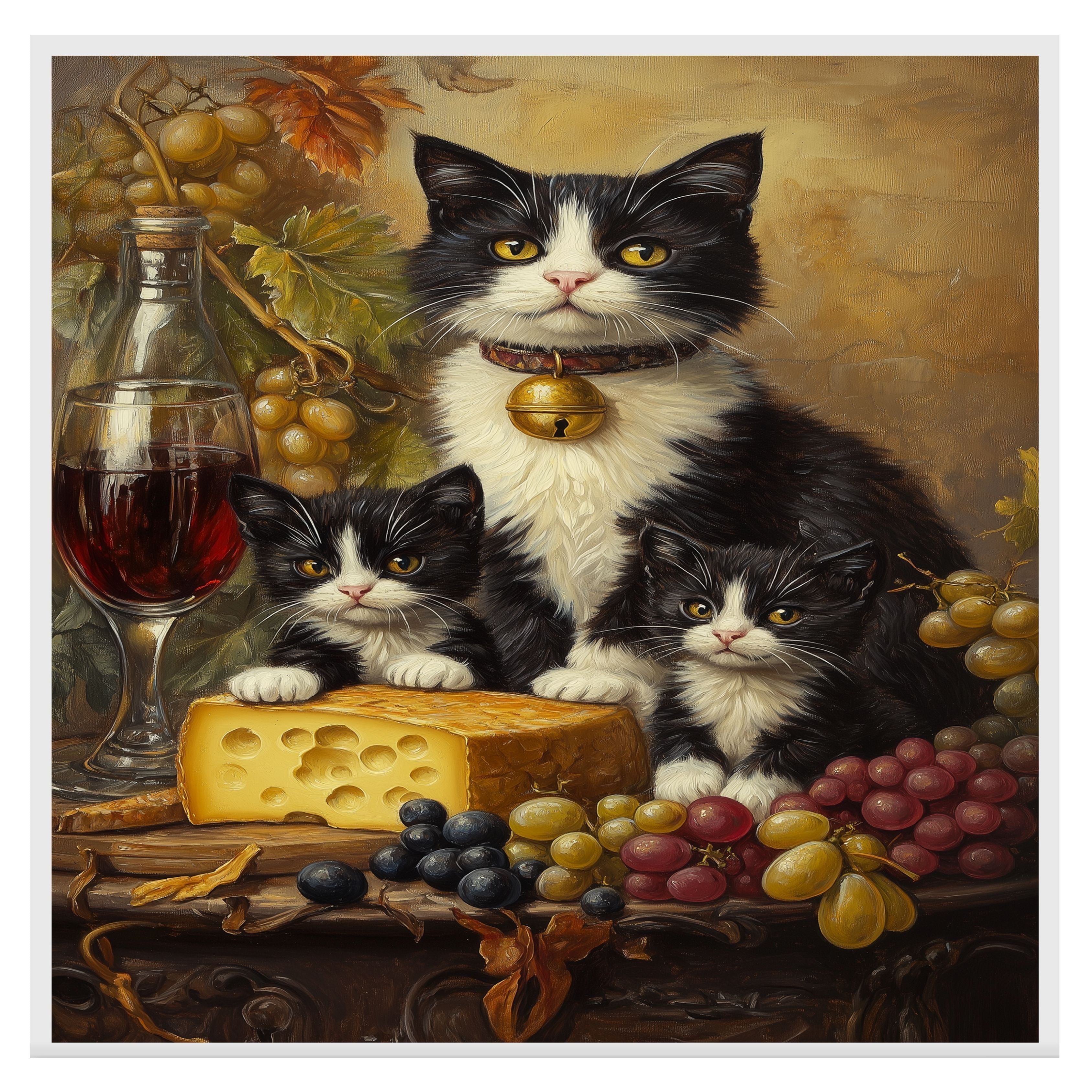 "Wine Whiskers" showcases a delightful scene of a tuxedo cat mom and her kittens joyfully enjoying grapes and cheese. This charming artwork blends whimsy and elegance, offering a touch of luxury and playfulness as the cats indulge in a leisurely moment of indulgence. Perfect for cat lovers and those who appreciate a fun, refined twist. Available on 1.5" thick canvas wrap, floating framed canvas, or flat rolled canvas.