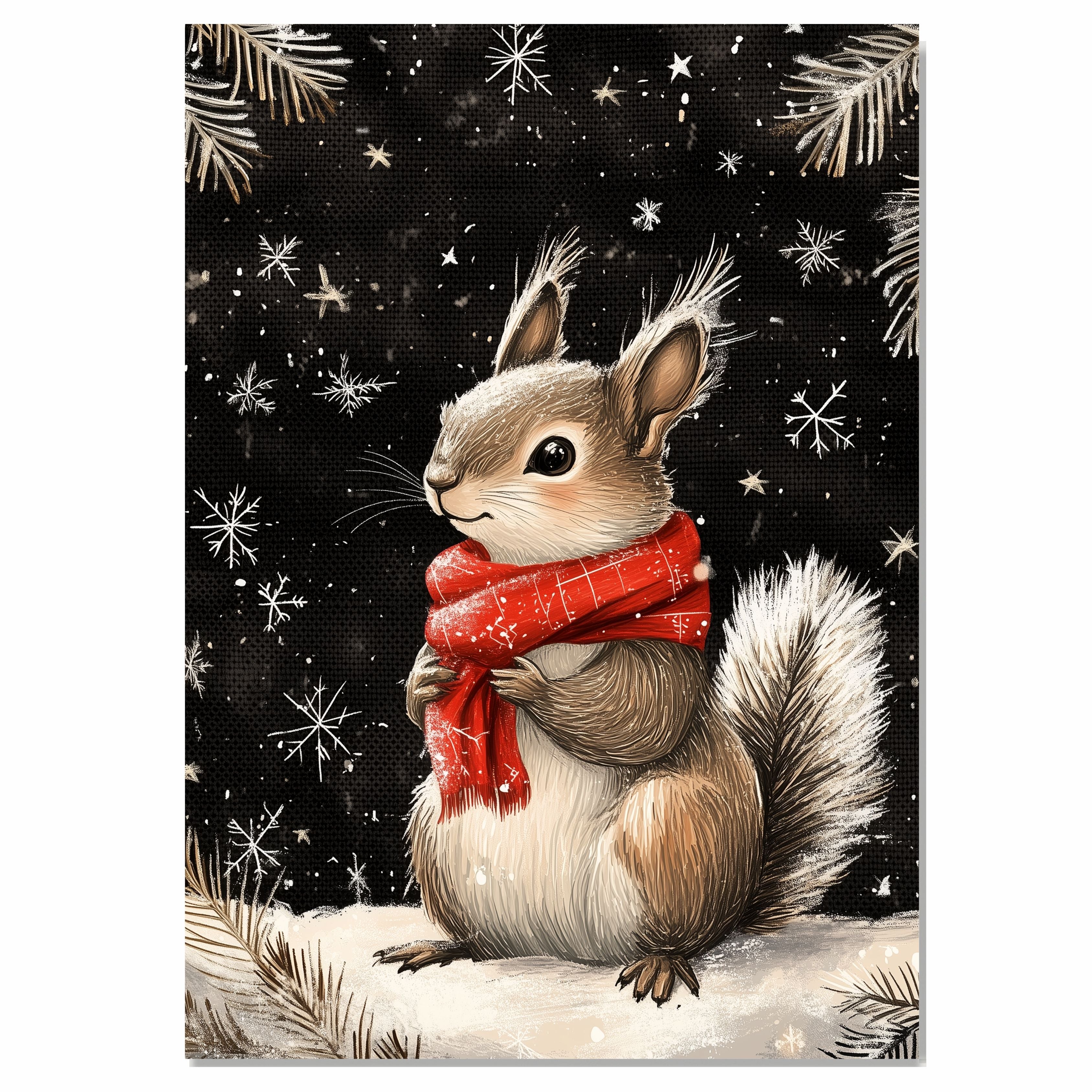 Our Winter Delight Squirrel Canvas Wall Decor adds a touch of festive cheer and cozy charm to your home. Featuring an adorable squirrel bundled in a bright red scarf, playfully frolicking in the snow, this heartwarming artwork captures the magic of winter. Available on a 1.5" thick canvas wrap, floating framed canvas, or as a flat rolled canvas, this joyful piece titled Winter Delight Squirrel brings a playful and seasonal spirit to your holiday decor. With its whimsical portrayal of winter fun, this delightful canvas makes a perfect focal point in any room and is sure to warm hearts throughout the season.