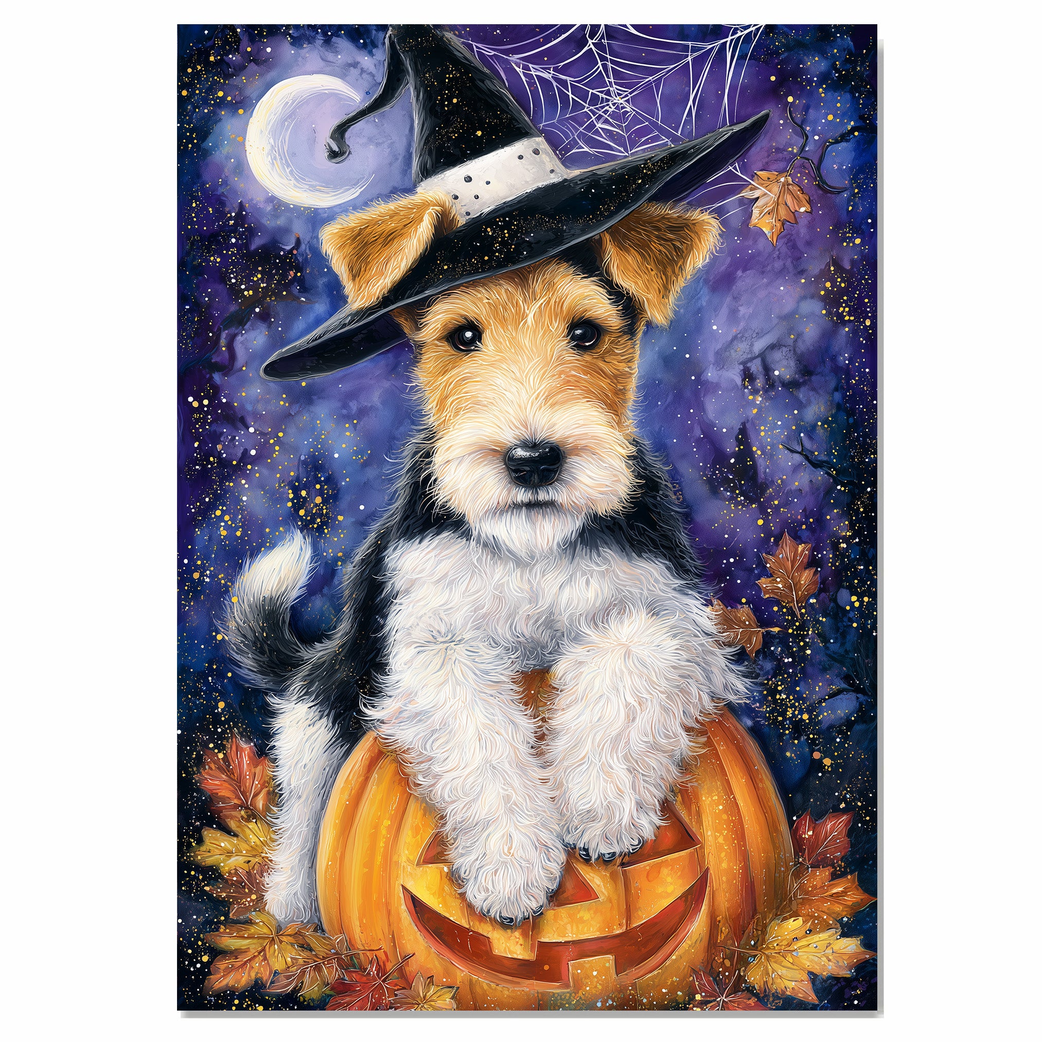 A festive Halloween painting of a Wire Fox Terrier puppy wearing a black witch hat with silver band. The playful terrier sits on a glowing jack o lantern surrounded by autumn leaves, spiderwebs, and a starry purple night sky. Perfect seasonal décor for dog lovers.