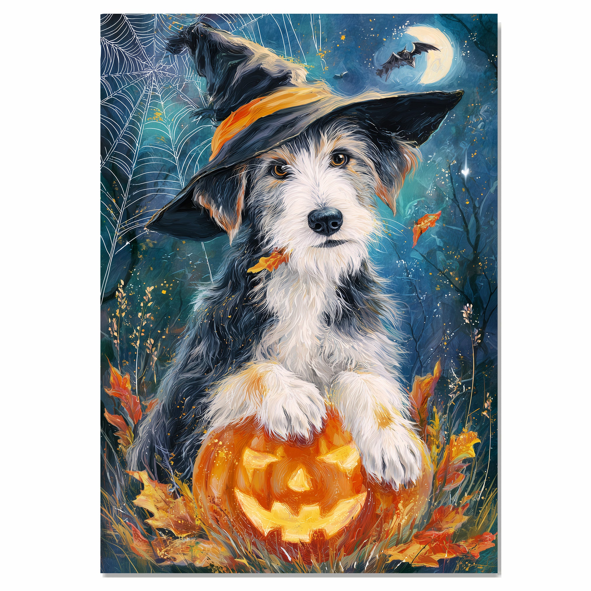 A charming Halloween painting of a Wolfhound puppy wearing a black witch hat with an orange ribbon. The playful pup rests on a glowing jack o lantern, surrounded by autumn leaves, spiderwebs, and a moonlit sky with flying bats. A perfect festive piece for dog lovers.