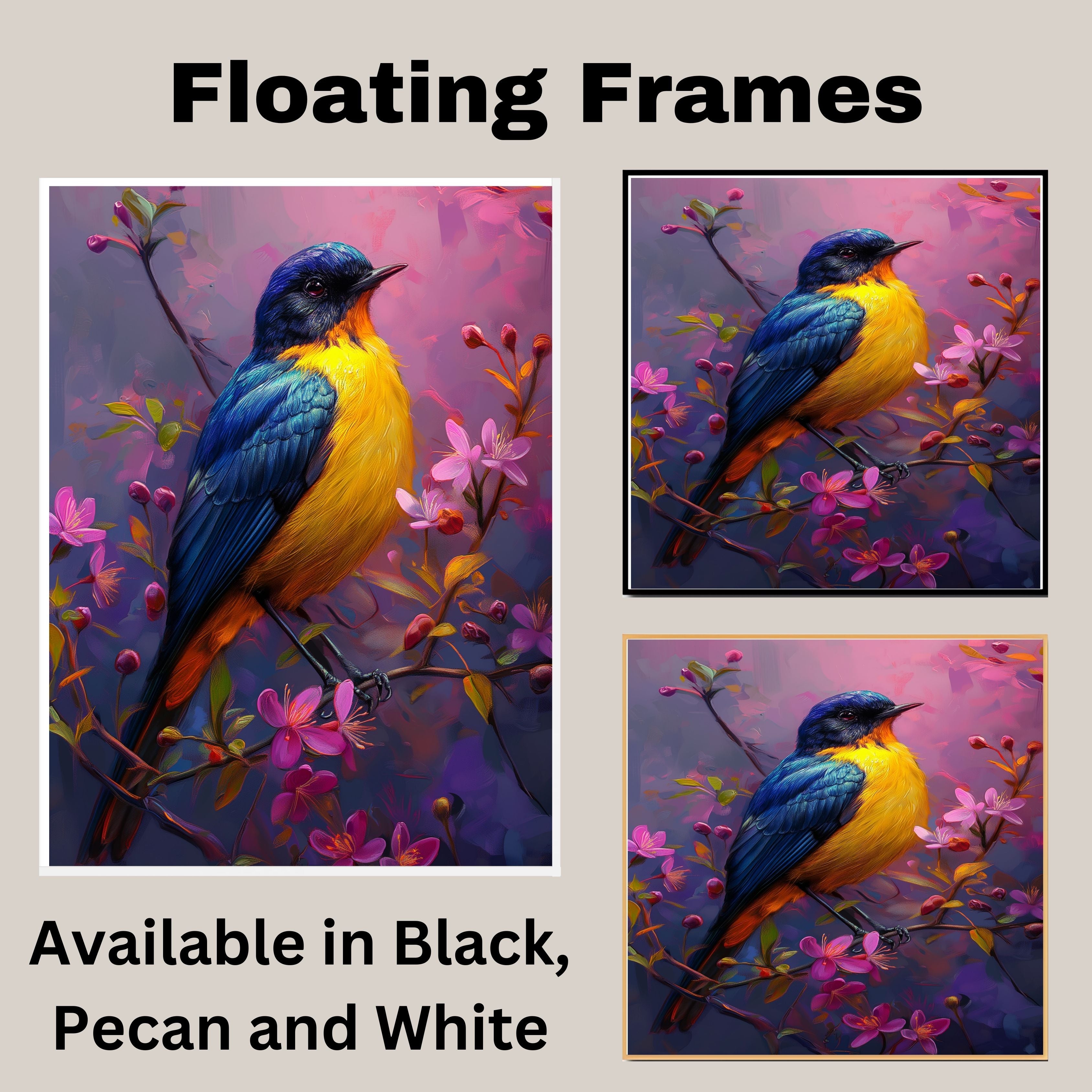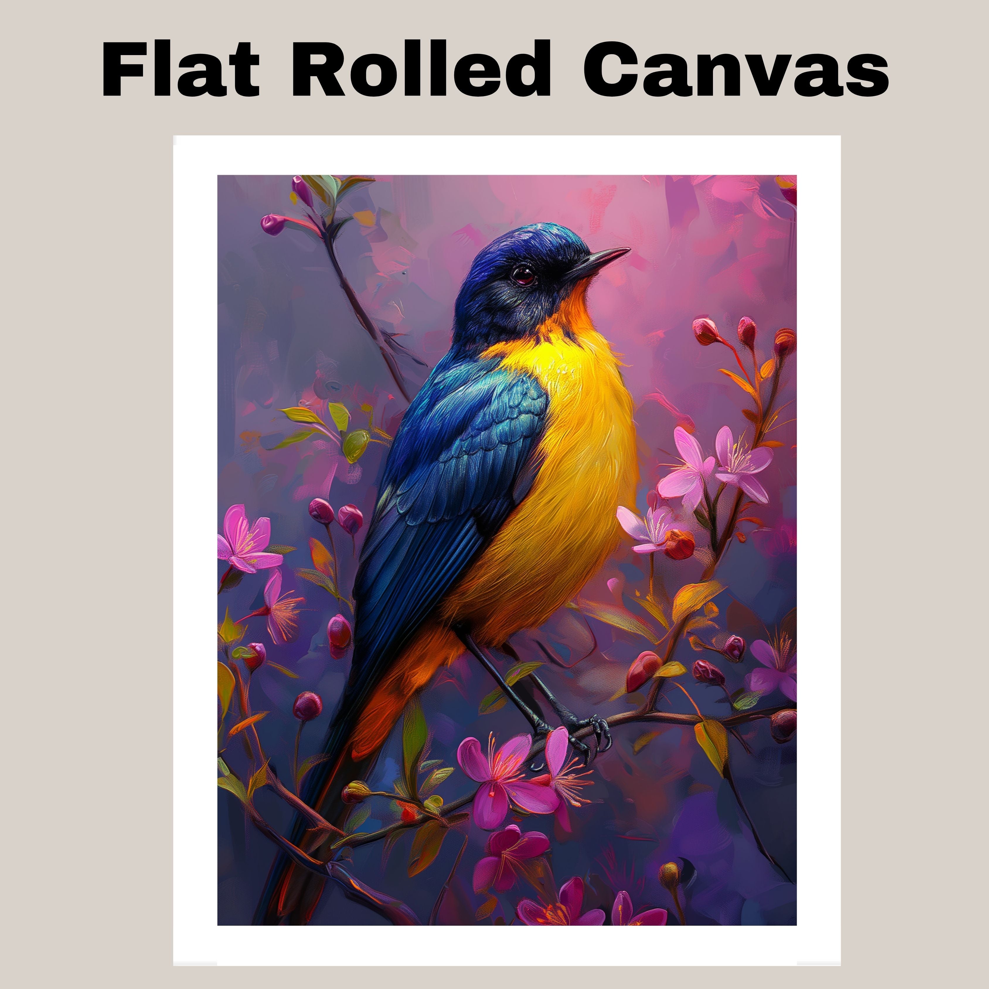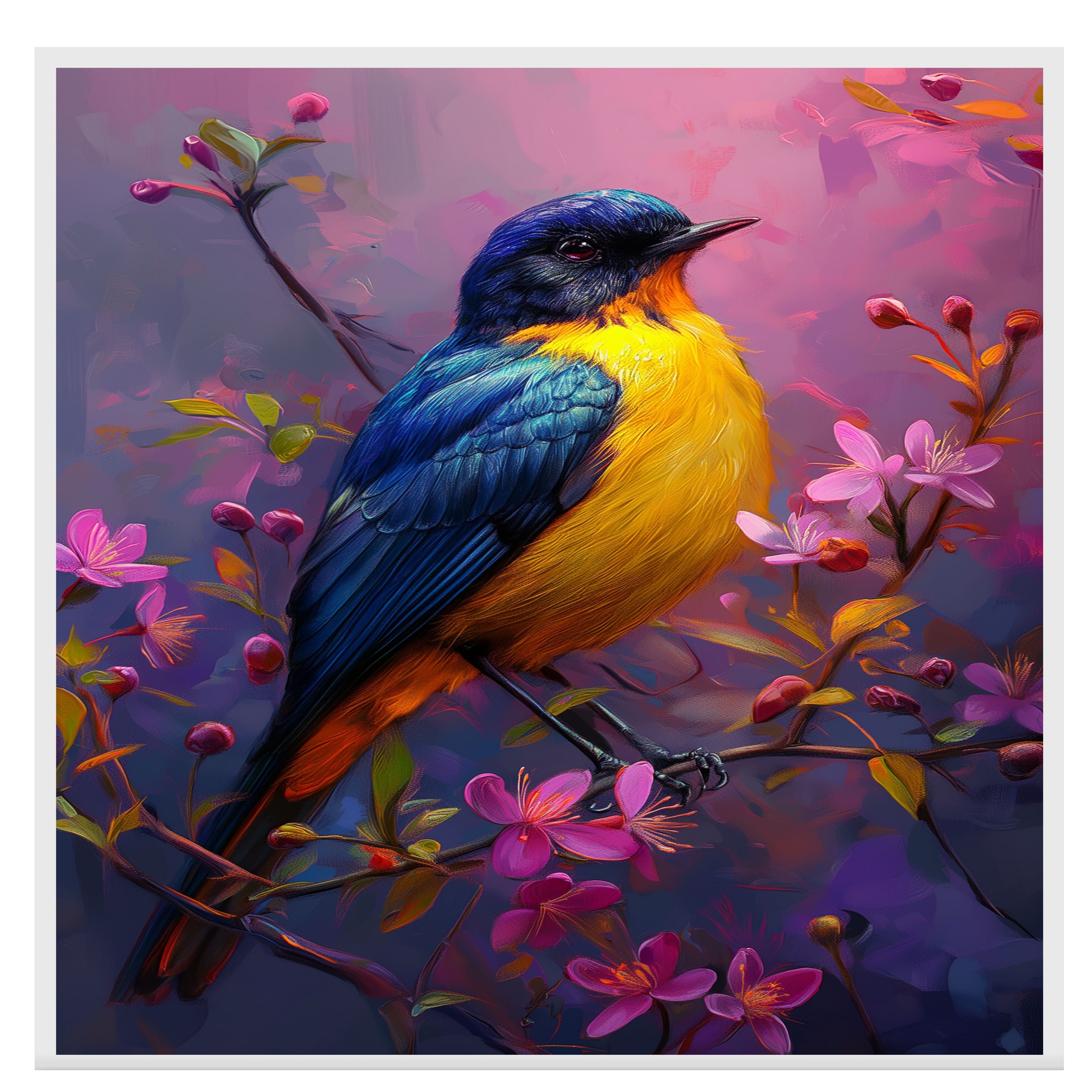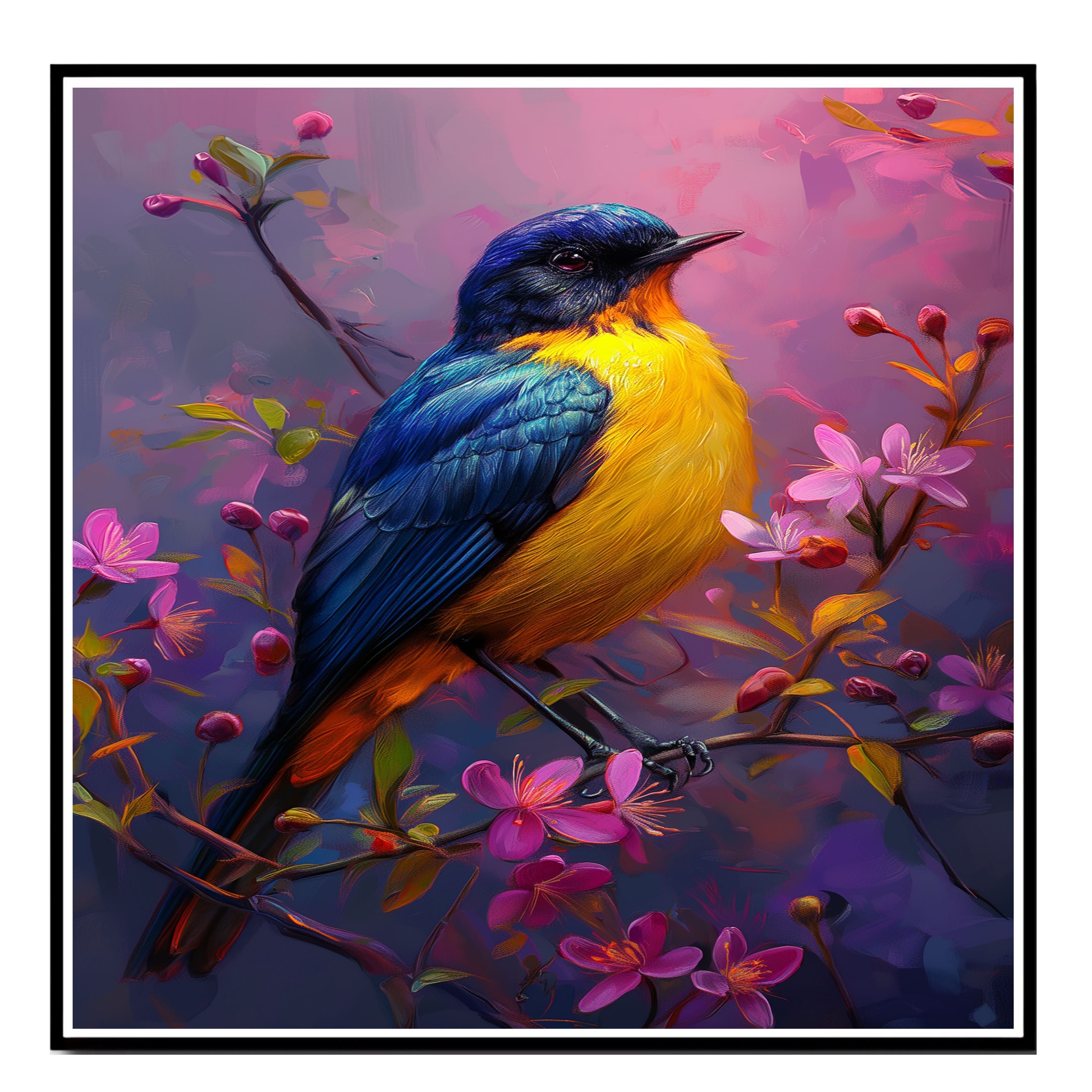 This charming painting features a brilliant yellow and blue songbird perched among blooming pink flowers, set against a lush purple backdrop. The soft florals and rich color palette create a romantic, nature-inspired piece that brings warmth and beauty to any setting.